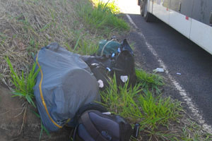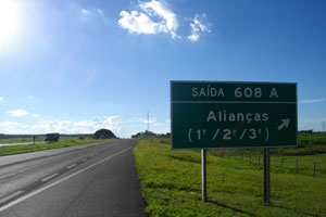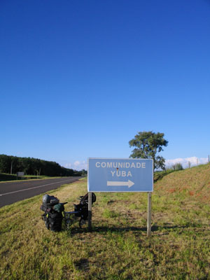 まぁ、大体の場所と方向さえわかっていれば、なんだかんだで辿り着けちゃうのはいつものこと。なんとかなるさと、先行き不透明なまま乗り込んだバス、一応方向としては、オイラが向かいたい方向を走っている。で手元のGPSを見ながら場所確認していると、そろそろこのあたりにあるのでは?という地点に近づいてきた。と、反対車線の看板に<Aliancas>の文字が・・・そうそう、弓場農場ってAlianca村にあるんです。慌ててバスの運転席へ向かい「ココで降ろしてくれ」とお願いする。途中で降ろしてもらうことは、乗ったときに交渉していたので、もめることなく、ハイウェイの途中でバスは停車。「こんなところで降りちゃって大丈夫なのか?」という運転手に「自転車があるから大丈夫!」と通じたのかどうだか分からない、なんちゃってポルトガル語で答えて、バスを降りたのでした。