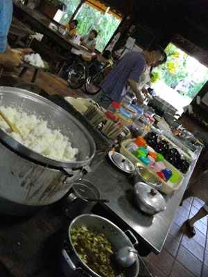 と、荷物の整理をしていたら、角笛の音が鳴り響いた。夕食の合図らしい。ここ弓場では、三食、食堂に飯が用意されていて、皆が、そこに食べに来るとのこと。到着して間もない、何もしていないオイラであったが、今日の夕食からお呼ばれさせていただくことにしたのでした。食堂に行って、並んでいる食事を見て驚いた。自分の好きなものを好きなだけ皿に盛るというセルフサービスバイキング方式の食事なんですが・・・この並んでいる食べ物が、極めて日本的。そして、噂に聞いていた通り、メチャウマのお食事をいただいたのでした。いやはや、ごちそうさまです、ありがとうございます。