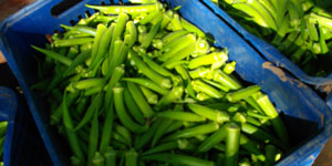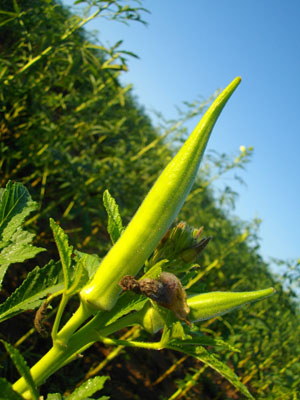 さてさて、もちろん今日も農作業。午前中は、まず、オクラの収穫作業のお手伝い。ちなみに、弓場ではいろんな作物を作っているのですが、オクラ、グァバ、マンゴーが、3大作物らしい。その中でも、オクラは、弓場農場の主力野菜らしく、月水金と週三日も収穫作業があるとのことなのです。