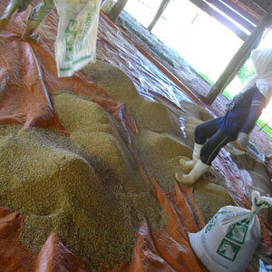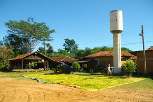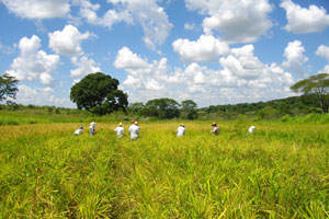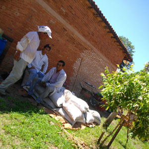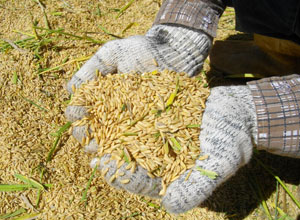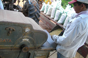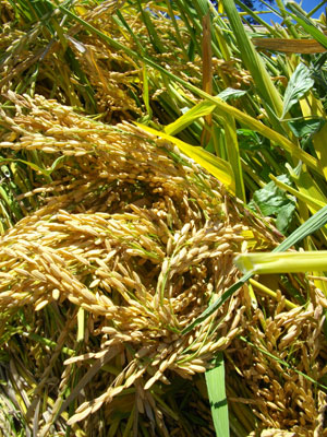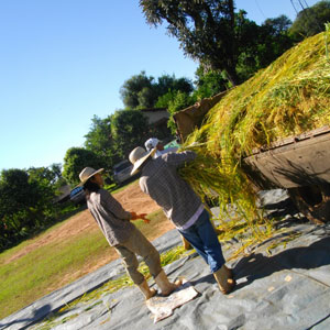 さて、敷き詰めた稲。この上をトラクターで何往復もする。こうすることで、稲穂から実の部分だけが落ちるというのだ。しばらく、トラクターで踏みつけた後、一旦、稲をひっくり返す作業を行い、再び、トラクターでの踏みつけ作業。そうしてできたペシャンコの稲じゅうたん、緑色の茎の部分を持ち上げると、下にギッシリとふりおとされた実が。ということで、いらなくなった茎の部分、少々残った実を払い落としながらかきあつめ、再び、トラクターの荷台に乗せていく。完全に分離はされないものの、ほとんど実だけになったシートの上。この風景を見て、稲を刈ったんだなぁってヒシヒシと実感が湧いてくるのでした。ちなみに、今回収穫した、このお米、もち米らしい。デンプン質の多いもち米を、パサパサのブラジル米にまぜて炊いて食べたりするらしいのです。午前中最後の仕事として、このもち米を袋詰め。詰める作業はいいんですが・・・詰め込んで50kgほどになってしまった、米袋を運ぶのが大変。詰めれば詰めるだけ重くなる米袋、詰めすぎ注意です。