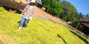 シートを屋根のある場所に移し、脱穀した米、していない米を分けて、再びシートに米を広げる。精米前の最終工程、陰干しです。いやぁ、お米って大変な手順を経て、米粒になっていくんですなぁ・・・その後の夕飯で出された、ご飯、そしてオクラ料理を食べる時の感覚が、いつもと違ったモノになっていたのは言うまでもありませぬ。