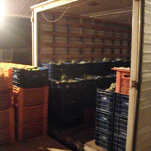 さてさて、やることが山のようにある弓場、昨日までの農作業から一変、今日から配達作業を手伝うことになりまして。弓場の畑では、自分達で食べる分以外に、商品として世の中に売り出す野菜&果物も作ってるんです。それらの作物、以前は、市場に卸していて、市場の人にとりにきてもらっていたらしいのですが、中間流通業者を挟むそのシステムだと、採算的にやっていけないということで、最近は自分達で販路を開拓し、販売しているそうなんです。街のスーパーマーケットに、自分達で商品を配達し、並べてもらう、と。で、その配達を手伝うことになったのですが・・・これがねぇ、朝3時に起きて、出荷する野菜&果物を仕分けながらトラック積み、150kmほど離れた街へ向かうという、なかなかハードな仕事が待っていたのでした。