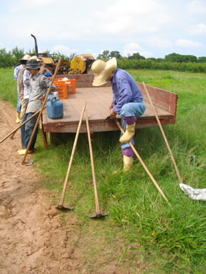 朝、月水金恒例のオクラの収穫作業。トラクターで向かうオイラ達、そのトラクターに添うように走って追いかけてくるのは、弓場で飼われている犬のジョン、シロ、ポチ・・・オイラ達がオクラとりをしている間、畑内を元気に走り回っているかわいいヤツラです。