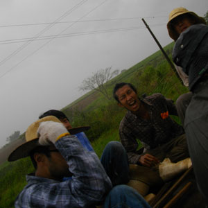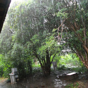 さて、午後も引き続き、同じ畑で雑草とりをしていたのですが・・・雲行きが怪しかった空、案の定、バケツをひっくりかえしたような雨が降り始めちゃいまして。慌てて撤退。基本的に雨が降ったら農作業はやらないという話を聞いていたのですが、晴れ男のオイラ、弓場に来て2週間、昼間の作業中に雨が降ることはほとんどなく、農作業中止、という状況にあったことがなかったのですよ。