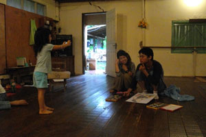 充実した午後の時間を過ごし、夕食。夕食後、今日は何をして過ごそうかと思っていたら、20時半から、バレエ小屋でエアロビが行われるという。マミちゃん&ゴウくんと一緒に覗きに行ってみることにしたのでした。小屋では、すでに音楽が流れていて柔軟体操中。チッカちゃんの指示のもと、難易度の高い柔軟ポーズが次々と。オイラ達も合流させてもらい、やり始めたのですが・・・体が全然曲がらない。サルバドールでカポエイラをやった時にも思ったのだが、オイラってメッチャ体が固い男。