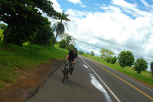 さてさて、午後は、これまた日曜日の日課となったミランダポリスまでの自転車走り。で、今日、ゴウ君もネットをやりにミランダポリスへ行くというので、一緒に自転車で行くことにしたのでした。ゴウ君はゴリさんの自転車を借りて行くことに。そうそう、このゴリさんチャリ、旅仕様のしっかりしたいい自転車なんですよ。なんでも、ここ弓場農場までチャリで旅行していた人が、ここでチャリ旅を終え、ゴリさんに託したチャリとのこと。もし、ここからチャリ旅を始める人がいたら、使ってもらうための自転車なのだそうです。そういえば、ペン園にもそんな感じで自転車が置かれていたし・・・そんな自転車を使わせてもらうと、南米、途中からチャリダーに変身ってことが可能ですよねぇ、ウンウン。