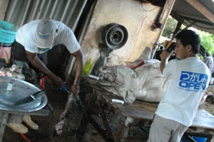 配達が終了し、弓場に戻ってまず昼寝。1時間くらい寝て目が覚め、外をブラブラしていたら、なにやら人だかりが・・・行ってみると、豚の解体をやっているじゃないですか。この間は、子豚の解体を見たけど、今回は、200kgもある、デカイ豚の解体作業。迫力がちゃいました。