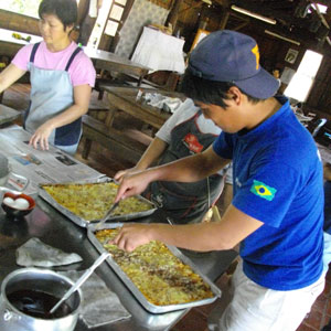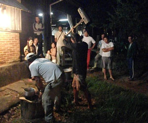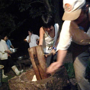 そして夕食後、オイラ達が刈ったもち米を使って、餅つきをするという話になりまして。餅つき!もち米の収穫をお手伝いさせてもらった時から、自らの手で収穫したもち米でお餅を食べたいって思っていた願いが叶うのですよ。食堂の裏に用意された石臼と杵。7時に、蒸したもち米が石臼に乗せられ、餅つき大会が始まったのでした。ツネさん、コーピンさんが交代でもち米の返しやってくれる中、交代で杵を突いていく。旅行者のオイラ達は、ピッタンピッタンって感じの音しか出せないのですが、弓場の人たちの突く杵は、音が全然違う。ドスンドスンと、気合の入りまくった音がするんですわ。オイラももちろん突かせてもらったんですが、結構な重さの杵にふりまわされる・・・杵でつくのは、男だけではなく、女の人も、子供達も参加。いやぁ、なんか、素敵ですこういうの。そして、つきたてのお餅をおろし醤油でいただく・・・はぁぁ、絶品ですわこれは。