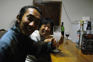 そして、夜、今日はウミがカクテルを作ってくれるというので、ウミの部屋に遊びにいったのでした。で、ドアを開けて入った部屋は・・・立派なカウンターがならぶ、まさにバーの店内。日本に行っていた時に、昼間の仕事とは別に、週に何回か、バーテンのバイトをしていたというウミ。ここ弓場に戻ってからは、部屋に、自分でバーカウンターを作ってしまったほどの、お酒つくり好きみたいで。不定期ですが、Bar海をここ弓場で開店しているとのことなんです。ゾクゾクと集まってくる皆さん。部屋はあっという間に、人でいっぱいに。次々に入るオーダーに忙しそうにシェーカーを振る、海。オイラはオリジナルカクテルをオーダー。ブルーオーシャンという素敵な名前のカクテルをいただいたのでした。それにしても、こんな立派なバーカウンターを自分で作ってしまうってところに驚きです。そして、<欲しいと思ったものは自分で作ってしまう>ということを当たり前のこととしてやってしまう、弓場の生活ってなんて豊かなんだろうって思っちゃうワケなのですよ。