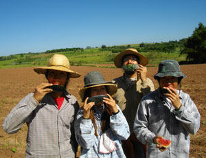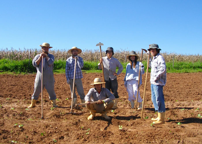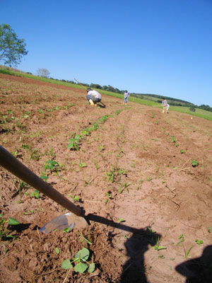 途中、畑の隣に植わっていたスイカを採れたての状態で、いただいたりして。きついながらも、皆で和気藹々と楽しみながら(?)やってるのでした。まぁ楽しむ余裕があるのは、最初のうちだけなんですけど(笑)。やっとのことで広かったオクラ畑のカルピが終了。一息いれて向かったのは、食堂裏の野菜畑。トラクターに乗せられて到着した野菜畑は、モウモウと雑草で覆われていたのでした。で、まずはモヤシ畑のカルピから。午前中には到底終わりそうもないこの畑を見て・・・ひょっとしたら今日は一日カルピ作業なのではと悪い予感が・・・そんな予感は的中するものでして。昼飯後、続行されたモヤシ畑のカルピ。モヤシ畑が終わったら隣にある花梅畑のカルピ。花梅畑のカルピが終了したら、フェイジョン(豆)畑のカルピ。フェイジョンが終わったら、マンジョッカ(芋)畑のカルピ・・・ぬはっ、やはり今日は一日カルピ作業で・・・後半の作業は、皆疲れ果て、自然と無口に。そんな中、最後のマンジョッカ畑のカルピ作業中、変なテンションで気合をいれていたコンちゃんの姿にツボってしまったオイラだったのでした。
