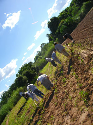 作業自体は、大変なんですが、青い空の下、大地を耕すというのは、なんだかとても気持ちのよい行為でして。こんなふうに、土を耕していると、なんかこの星とつながっている感覚がして心が落ち着いてくるんですよ。「地球にやさしく」と環境問題が騒がれている昨今ですが、正直、そんなにピンときてなかったんですよ。なんか概念として耳には入っていたけど、実感がともなわないっていうか・・・でも、農作業をするようになって、ホント、地球のことを考えるようになってきている自分がいるのを感じるようになってきました。ヨシさんに、アル・ゴアの<不都合な真実>とか借りて読み始めちゃったりしてね。