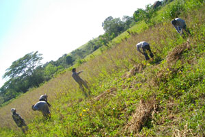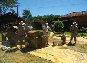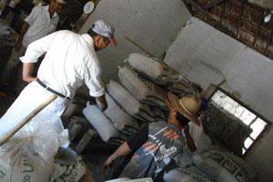 とりあえず、お昼近かったので、食堂に戻ったところ、食堂前で、ツネさんたちが、昨日おとついに収穫した米の脱穀作業をしていたので、お手伝い。昼食後は、引き続き米の詰め込み作業などを行ったのでした。詰め終わったお米を袋に入れ、45kgほどになった袋を保存庫へと運び込む。筋トレになります、この作業。