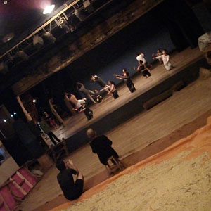で、このお米、収穫を始めてから今日まで、乾燥させるために、テアトル弓場の舞台上に採れたお米を敷いていたのだが、今日、そのお米の袋詰めが終了し、舞台が舞台として機能するようになった。そうそう、弓場の芸術活動、いろんなところで、垣間見せてもらっていたのですが、弓場アートのシンボルである、ここテアトル弓場が機能しているところは見たことがなかったんですよ。オイラが来てすぐお米の収穫が始まっちゃったんで、いつ行っても、お米置き場としか見えなくて。で、今晩、お米が片付いてきれいになったその舞台で、ソーラン節と、バレエの稽古が始まったのでした。バレエの指導者であるアキコさんが見つめる中、舞台の上で踊る弓場の皆さん。広い舞台で肉体を思う存分使いきり繰り広げられる肉体パフォーマンスの迫力は・・・いやぁ、圧倒されました。ダンス小屋での練習は時々覗かせてもらっていたのですが、舞台上でのパフォーマンスは全然違うものでして。本番、衣装や照明をつくりこんだ舞台は、さらに凄いことになるんだろうなぁ・・・
