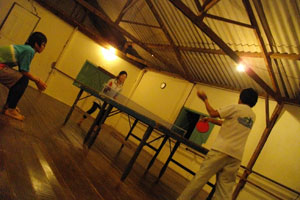そして、夜卓球で盛り上がる。昨日から始まった、ゴウくん&マミちゃんペアと、オイラ&コンちゃんペアでのダブルス勝負。負けたチームが、勝ったチームに、明日のご飯時にお茶とかデザートを持ってくるペナルティを賭け勝負なんですが、昨日の結果は、オイラ達の惨敗。2セット先取ゲームで1セットもとれず。今日こそはと再戦に挑み、ゲーム的には結構緊迫したいい試合をやったんだけど・・・勝てない。ちくしょー。