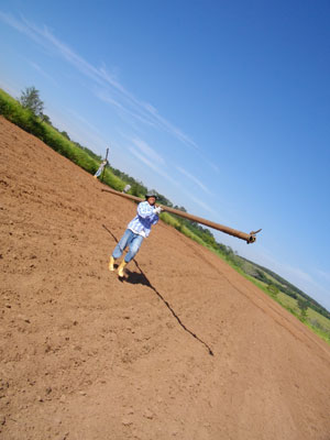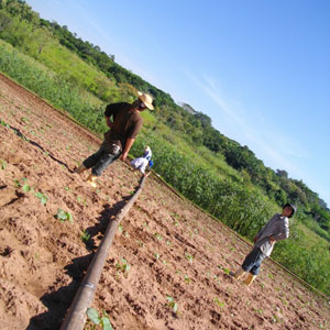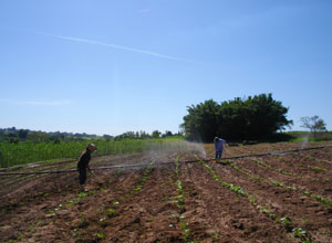 さて、雑草取りをやっていると、畑の反対方向からユウゾウさんとルイスの呼ぶ声が聞こえてきた。畑の反対へ行ってみて、指示されたのは、水撒き用の水道つくりのお手伝い。4mほどのパイプ管を畑の真ん中に運び、それをつないでいく。畑の端に設置されたパイプ口(モーターのある給水所から引かれているパイプ口)につなげ、水を運ぶ仕組みとなっているんです。なるほど、畑にはこうやって水を運んでいるんだぁ、と重いパイプを肩に担ぎながら感心するオイラ。水を出すと、途中途中に開いている穴から霧吹き水が噴出しはじめた。炎天下、ジリジリ暑さを与える太陽光線の下で作業するオイラ達には、心地よい水のシャワー。ここに植えられているオクラの芽たちも、こんな風に霧吹き水の涼しさを感じているのだろうか?