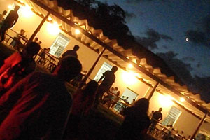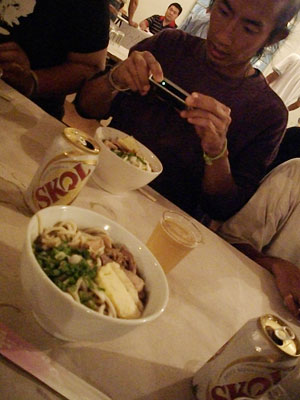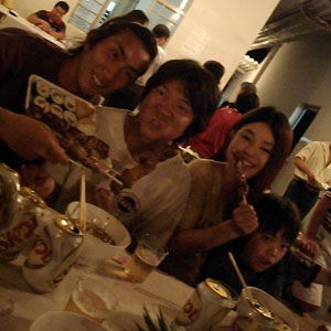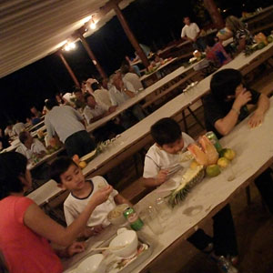 さて、午後のオクラ畑のカルピ(雑草取り)を終え、夕食・・・と、今日は、第一アリアンサで、青年会が主催するうどん会なるパーティが開催されるのです。この地域の若者たちが運営して行われるこのパーティ、オイラ達旅人も連れて行ってもらえることになりまして。会場に着き、テーブルに出されたのは、うどん、寿司、シュラスコ(焼肉)、揚げ餃子、漬物、果物・・・すっかり居酒屋ムード。久々にたっぷりビールもいただき、ほろ酔い気分。