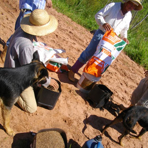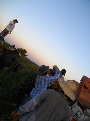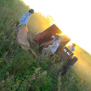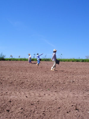オクラ採りの後、男連中はその場に残り、隣の畑への種まき作業。なんでも牧草用の種まきとのことで、広い畑にとにかくまんべんなく散らしながら撒いていけばよいと言われ、列を歩きながら、一握りの種を適当な間隔で空中に放り投げる。後は風が散らしてくれて、地面に落ちる頃にはいい按配で種が散らされているのだ。種まき終了後は、放水車運び。別の畑に置いてある放水車をトラクターの荷台に運び上げ、他の畑まで移動・・・