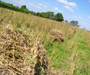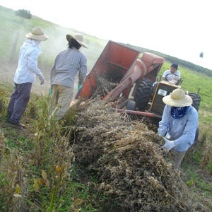 感傷に浸る暇もなく、1時半過ぎに午後の仕事開始。先週大量に引っこ抜いた大豆を脱穀する作業が始まったのでした。まず引っこ抜いてバラバラに置かれている大豆を適当な山になるように数箇所に集める。集めた山の横に脱穀機トラクターをつけ、歯車がグルグルと回っている脱穀機の挿入口に大豆を枝ごと放り込む。すると、脱穀機が枝はおろか、皮まで剥いてくれ、小さなまんまるい大豆だけが、きれいにとりだされ、袋詰めされていくのです。この作業、初めは、山作り班と、放り込み班の二手に分かれて作業することに。イメージ的に、放り込み作業の方が楽そうな感じがしません?オイラはソウ思ってたんですが・・・いやぁ、放り込み作業の方が、3倍くらい大変。モウモウと細かい粉塵がただよう中、息苦しく作業しなきゃいけないし、なにより、脱穀機に合わせて作業をしなきゃいけないから、うまく休みが取れない。山作りは自分のペースで動けばいいから、疲れたらちょっと休憩なんてこともできるんだけど、この放り込み作業はひたすら動き続けねばならなくて。さらに、この脱穀機、もともとトウモロコシを脱穀するためのマシンみたいで、大豆でやると、うまく吸い込んでくれず、つっかかるんですよ。それをうまく調整しながら投げ込むってのが意外と難しくてね。