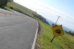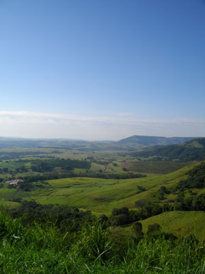 メイン道路ではなくなるためか、Botucatuの町を出ると300号線は急に細くなった。基本対抗一車線ずつで、路肩も狭い。そして、しばらく走っていると、周囲が山の風景になってきた。今までどちらかというと、緑の平原的な風景ばかりが続き、いい加減その風景を見飽きてしまっていたオイラには、ちょうどいい風景の切り替わり。前よりも激しさを増すアップダウンではあったのだが、なかなか心地よく走れた。
