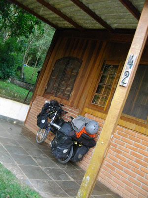 で、時間的に目的地としていた町まで行けないことが分かり、その前のCabreuvaという小さな町で今日は終わりにすることにしたんですが・・・町に入って、ホテルがあるかと聞いたところ、この町にホテルはないという。ただ、街外れに一軒だけあるのだが、そこはえらい高級ホテル。一泊150レアル近くするというリゾートホテル。う~ん、どこか寝泊りできるところはないですかと、突っ込んだところ、ポサダなら町からちょっと離れたところにあるよとのこと。そういえば、さっきこの町に入る前に、でっかいポサダの看板を見たような。というワケで、来た道を引き返し、ポサダへ。一見、リゾートホテルっぽいつくりのこのポサダ、高いんだろうなぁと思いきや、素泊まりだったら25レアルでいいよと。そのかわり、ベッドカバーもタオルもださないけど、あなた持ってるんでしょ、と。ええ、それで安くなるんなら、僕としてそちらのほうが好都合です、と交渉成立。部屋に案内してもらったのですが・・・案内された部屋は、ロッジ。3部屋くらいある建物の置くにはキッチンも。冷蔵庫もガスも使える。もちろん、シャワー・トイレつき。えぇ~これで25でいいんですか?町から離れたところにあるこのポサダ、飯はどうしようと思っていたところだったのですが、このキッチンを見た途端、自炊決定。ちょうどパスタのあまりはあるし、ツナ缶もあることだし。