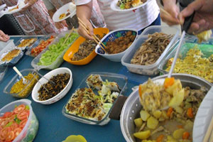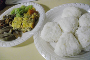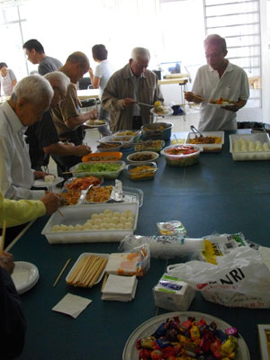 で、お昼。お言葉に甘えて、食事会に同席させてもらうことにした、オイラとコンちゃんとユウジくん。バイキング方式でお皿に盛っていく料理テーブルには・・・弓場を出たらしばらく食べれないだろうなぁと思っていた日本食の数々。いやはや、いいんでしょうか、こんないい目にあわせていただいちゃって。鹿児島県人会の皆さん、ごちそうさまです!ありがとうございます。例によって、たらふくいただいちゃった、オイラ。その様子を見てか、園田会長が「どうせ余るんだから、夜ご飯用にお皿に盛ってとっていっていいぞ」と。えぇぇ、いやいや、そんな・・・ありがたくいただいて帰ります。