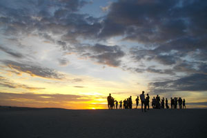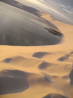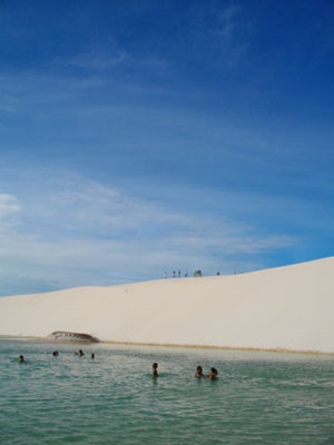 ここ、とにかく観光客が多くて。オフシーズンだというのに、湖には人人人・・・ちょっとねぇ、静かに自然を堪能したいオイラとしては、こんだけ人がいると、ゲンナリ(オフシーズンでこんだけ人がいるんだから、オンシーズンだとどんなことになるんだ?ここは)。しかも、ツアー内容が、とりあえず、湖に連れて行くから、その辺で泳いでてみたいな感じで。もっと砂丘をグルグルと歩き回りたいオイラとしては、フラストレーションが溜まる一方。景色はいいし、湖で泳ぐのも気持ちいいんだけど・・・なんか物足りない。レンソイス・マラニャンセスに期待していたのは、こんなもんじゃないって気持ちになってくるのでした。結局、Lagoa Azulと、Lagoa Peixeという代表的な湖二つを巡って終了。ちょうど日の沈む時に、Lagoa Azulに戻ってきて、夕日に染まる砂丘と湖の画は、さすがに感動モノでしたが、う~ん、なんだかなぁという気分がずっとつきまとうツアーだったのですよ。