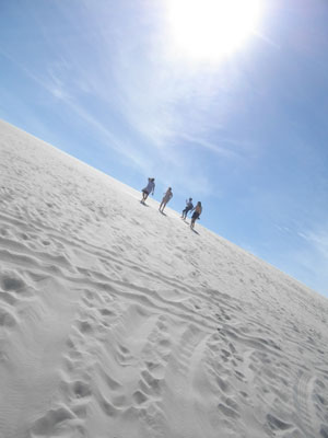 ジープから降りて、目の前の砂丘の山を上る。石英のサラサラ砂は見た目はキレイなのだが、歩くのにはやっかいな代物。なかなか前に進めないところをがんばって上り、砂丘の頂上から眼下を眺めると・・・思わず「おぉぅ・・・」と声が漏れてしまうほどの絶景が!巨大なコバルトブルーの湖が見えたのでした。しかし、猛烈に感動できたのは、最初の一瞬のみ。
