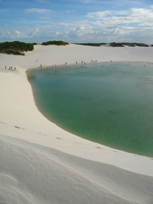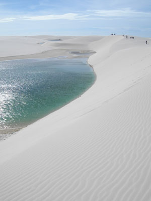 さて、そんなレンソイス・マラニャンセス、広大な真っ白い砂丘地帯が広がっていて(東京都23区が二個入るほどの大きさ!)、雨季の間に降った水が、砂丘のくぼみに溜まり、湖を形成し、それはもう、この世のものとは思えない風景をかもしだすという場所なのです。ちなみに、レンソイスってポルトガル語で<シーツ>という意味らしいです。レンソイス・マラニャンセスで、マラニャンセスのシートという意味。なるほど、白い砂丘のことをシーツと例えているのかな。そうそう、レンソイスっていう地名の場所なら、ブラジルにいくつかあるんですよ。サルバドールの近くにも<レンソイス>というスポットがあったなぁ。
