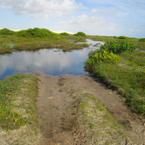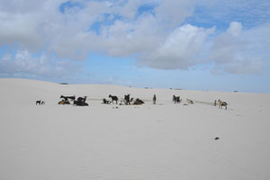 さて、ここアティンス村からレンソイス・マラニャンセス国立公園までは距離にして4kmほど。普通に1時間くらい歩けば、砂丘の入り口まで辿り着くことができるのです。砂道が続く村の通りを歩き、牛や馬が放牧されている湿原地帯へ抜ける。水が溜まって歩くのが困難な(だが楽しい)湿原地帯からは、遠くに砂丘が見えてくる。近くにあるようで意外と遠い砂丘。距離感がよくわかりませぬ。