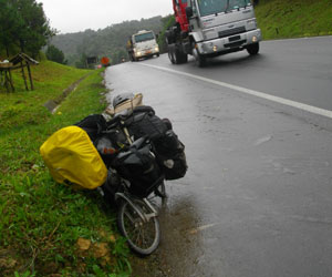 で、ようやく山の下に下りたのだが・・・雨は止むことはなく、逆に激しさを増してきた。普段だったら雨宿りするか、走るのをやめて宿に退避するところであるが、ブラジルビザの残りが今月半ばで切れるオイラ、急がなきゃという想いがあり、雨の中をひた走るのであった。