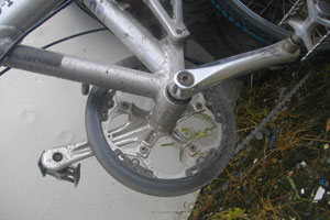 そんな降ったり止んだりの天気の中、走っていたら、ペダルを回す度に、<カキッ>っと変な音がするようになった。実は、ちょいと前から、ペダルの軸の部分であるボトムブラケットに軸がブレ、ペダルをこぐたびにユラユラするようになっていたのが、気になっていたんです。まぁとりあえずユラユラするだけで、走りには支障はなさそうだったんで、そのまま走り続けてきたんですけど・・・変な異音が発生するようになっちゃって。これは、ヤバイ。最初は不定期だったその音も、次第に一回転毎に鳴り出す始末。そして、<カキッ>どころが<ギャッ>と、今にも折れてしまいそうな変な音がするようにもなってきちゃって・・・昨日のスプロケット部に続いて、今日も故障とは・・・パーツの寿命ってだいたいどれも同じってことなんでしょうかね。壊れる時は同時に壊れる、と。これだったら、ボトムブラケットも昨日直してもらえばよかった。というか、クリチバに居る時に壊れてくれたら、ジックリ直せたのに。暇は山のようになったのだから・・・と、いろいろ思うも、とにかく壊れはじめたのは、今なのだから、これからどうするかを考えなきゃいけない。