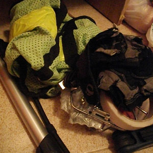 まず、カバンの中を探る・・・壊れた空気入れとか、破れた手袋とか、マスキング用のテープとか、予備用の六角レンチとか・・・出てくる出てくる、使っていないモノたち。これらは、もうこの先も使うことはないだろうなと判断し、ここでお別れ。ただ、いらないと思ったモノでも、部品として使えそうなモノは、分解して、必要な部品だけもっていくことに。
