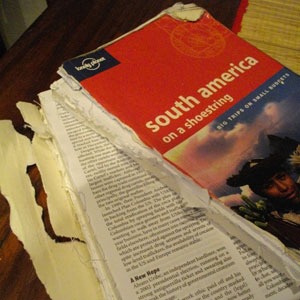 そして、次にターゲットになったのは、本。南米版ロンプラは、残すところウルグアイとアルゼンチンとチリの情報さえあればよい状態になったので・・・ウルグアイ、アルゼンチン、チリのページだけ切り取ってもっていくことに。分厚いロンプラ、結構重かったですからねぇ。これで結構軽くなりましたよん。そして、もしかしたらまた使うかもと思ってとっておいた地図たちも、ここでお別れ。さらに、サルバドールでAKくんからもらったエジプトの地球の歩き方。そのうち行くから、必要っちゃ必要なんですケド・・・エジプトはまだまだ先。ずっと持ち歩くのもなんなので、全ページ、デジカメで撮影して、本自体はここに置いていくことに。
