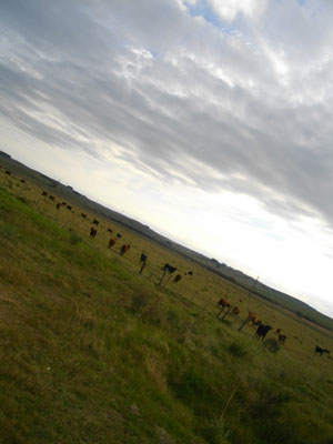 見送ってくれたロドリゴと奥さんに別れを告げ、出発。町を抜けると、ひたすらのどかな牧場風景が広がりはじめた。この風景、ブラジル後半に飽きるほど見てきた風景ではあるのだが・・・何かが違う。自転車が違和感なく動いているからとか、すれ違う車が穏やかなスピードで走っているとかいう心理的なことではなく、見た目の感じが違うのだ。ナンだろうと思ってよく見てみると・・・ウルグアイは、草がきちんと手入れされているのだ。ブラジルは、沿道の草地はひたすらボウボウに草が生えていた。まぁあまりにも広すぎて手入れなんてしていられないんだろうけど。一方、ウルグアイも牧場面積はブラジルに負けないくらい広いにも関わらず、きっちり刈り込んであるのだ。そのせいで、ウルグアイの牧場は、なんか洗練されているイメージを受ける。