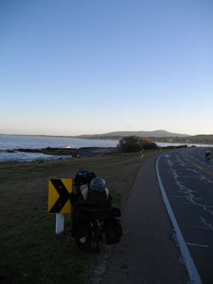 明るくなり始めた7時半頃キャンプサイトを出発。しばらく海岸線を走る。今日も手が凍るほど寒いのだが、カバンからフル手袋を取り出すのを忘れた。次回、かならず忘れないようにしよう。