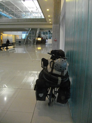 船から下りて、バゲージ・クレイムへ。預け荷物をした人たちのカバンがベルトコンベアの上に次々と乗せられ、送られてくるのだが・・・オイラの自転車は出てくる気配はない。もっとも、ベルトコンベアの上に横倒しで乗せられて出てきても、「なんて扱いをするんだ!」って憤慨することになるんだろうけど。で、全ての客の預け荷物が受け渡された様子で、ベルトコンベアの上には何もなくなった。んん~、オイラの自転車は?とベルトコンベアの裏側へと続く出入り口を通って裏へ回ってみると、一人のオジさんが話しかけてきた。「どうした?」「自転車を預けたんですが」「おお、今、船から運び出しているところだ・・・来た来た、あれだろ?」指差すオジさんの人差し指の先を見ると、BD-1を押しながら近づいてくるオニイさんが。おぉ、特別扱いありがとうございます。ムッチャグラシア~ス!