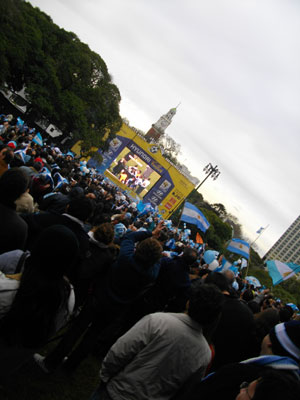 前半で2点を入れたアルゼンチン。メヒコもいい攻めをしていますが、流れはアルゼンチンってムード。これは、外は盛り上がっているだろうなぁ・・・試合の中身よりは、サッカーに対してのアルゼンチン人の情熱の方が気になるオイラは、後半からでも、パブリックビューに行ってみることにしたんです。