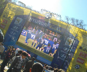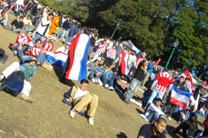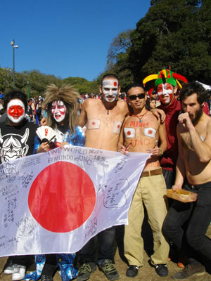 サンマルティン広場にあるパブリックビューに到着すると、赤と白の風船を持って応援しているたくさんの人たちが。おぉ、日本を応援する人たちっていっぱいいるのねん、と思っていたら、この風船、細長い。赤と白はストライプになってまして・・・赤と白のストライプカラーって、パラグアイチームのカラー。パブリックビュー前の会場で、赤白風船を振っているのは、パラグアイチームの応援団だったのです。それに対して日本の応援団は・・・う~む、数的には圧倒的に負けているかも・・・が、派手さでは全然負けていなかった。顔面ペイント、おっぱいペイント・・・白地に丸い赤の日本イメージを体で表現しながらの応援団。