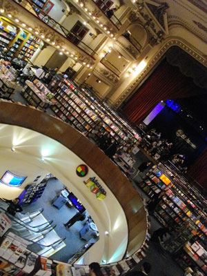 まずはSantaFe通りを西方向へ。SantaFe通りの1860番地にある<本屋>へ向かう。"世界で二番目に美しい本屋"という肩書きをつけられたらしい、ここにある<El Ateno>という本屋、本好きのオイラとしてはぜひぜひ行っておきたい場所なのでして。てくてく歩いていくと、通り沿いに入り口発見。中に入ると・・・う~ん、ゴージャス!昔、劇場だった場所を改装して作ったというこの本屋は、本屋らしからぬ雰囲気。