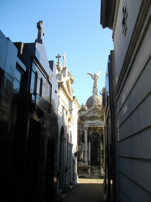 アルゼンチンの富裕層の人たちが死後埋葬されるというこの墓地、ところ狭しと、豪華な<家みたいな>墓が並んでいる。狭い路地を歩いて、これらのお墓たちを見て回るのだが・・・なんだか妙な気分。お墓なのに、お墓を歩いている気がせず。建物のイメージが一般的な<墓>のイメージから大きくズレているからだろうか?この建物の中には、防腐加工しただけの遺体が<眠っている>(ここでは、火葬はしないみたいです)という事実を想像し、ようやく、死をそこに感じることができる。ちなみに、アルゼンチン人に今も親しまれているエビータの墓もここにあります。