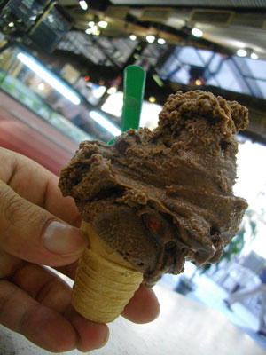 <Bar Sur>を後にして、引き続きブラブラ街歩き。そして入ったのが、美味いと評判のアイスクリーム屋<OLIMPICA>。素材の味を生かした味が売りのここのアイス、チョコ好きなオイラとしては、まずはチョコレートアイスを食べたくて。オーダーしたのは、アーモンド入りチョコ。これが、マジうま。アーモンドが大粒のままこれでもかっていうくらい入っている。あぁ、チョコとアーモンドの見事なハーモニーにクラクラ・・・