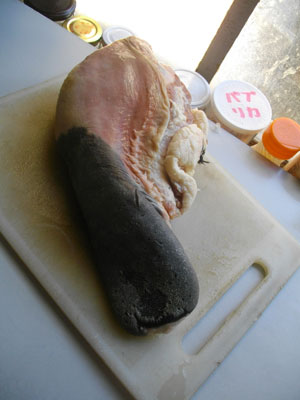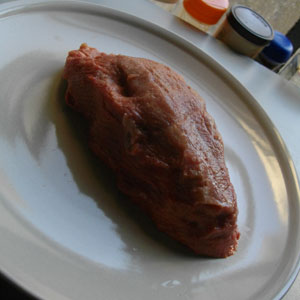 さて、宿に辿り着き・・・買ってきた牛タンの調理開始。キッチンに行って、買ってきた牛タンをまな板の上に。ど~ん、と<舌>という存在感。うへぇ~、改めてみると、やっぱり、グロテスクだなぁ・・・これ。以前ネットの動画で見た牛タンのさばき方を思い出しながら、包丁を入れる・・・う~ん、でも、以前動画で見た牛タンは、もっと長かった気がするのだが・・・オイラが今回買ってきた牛タンは、そんなに長くない。これ、子牛の牛タンなんだろうか?