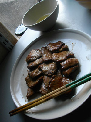 タン塩用の部分を適当な厚さに切り分け、塩をまぶして下味をつけた後・・・フライパンで焼く。焼いたそばからつまみ食い・・・う、うまい!いやぁ、牛タンを思う存分食べれるなんてねぇ・・・こんな贅沢しちゃっていいのかしら。