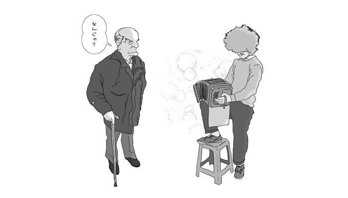 さてさて、そんなお話タイムをはさみつつ、午後からずっと取り組んでいた、今日のお絵かきモチーフは、街でみかけたおじいさんと、バンドネオン奏者のお兄さん。今日は、だいぶディフォルメして描いてみました。実物は・・・お兄さんは、こんなに髪モジャじゃなかったし、おじいさんは、もっと優しそうな人だったんですけど・・・