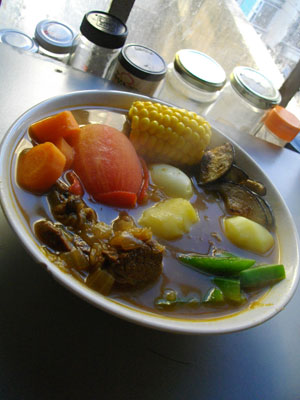 さて、帰り道、食材を買いに行こうと、近くのスーパー<DISCO>に向かったのだが、いつもは通り過ぎる隣の店の店内に、ふと目が移った。どうやら、スパイスやらソースなどを扱っている店みたい。興味本位でそのお店<NEW GARDEN>に入ってみたところ、前々から欲しいと思っていた、カルダモンとナツメグを発見。これらのスパイス、カレーを作るのに、無いなら無いで、かまわないんですが、より複雑な味を演出するためには、あったほうがいいスパイスなんですわ。早速購入。新しいスパイスを入手したからにはカレーでしょ、と思うもののコッテリしたカレーライスという気分ではない。ということで、今日は、この旅初となるスープカレーを作ることにして、スーパーDISCOにて、ジャガイモ、ニンジン、なす、ピーマン、玉ねぎを購入。