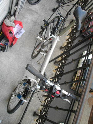 そんなこともあり、今回の荷物送付で<できれば入手しておきたいもの>ナンバーワンであった泥除けをいれてもらったんです。準純正らしい泥除けアルミフェンダーなるものがありまして。取り付けても、折りたたみに影響なしというシロモノ。そのアルミフェンダーを早速取り付ける。ネジがいっぱい入っていて、一見めんどくさそうに見えた泥除けの取り付けですが、意外と簡単。前輪、後輪と作業して、あっさり取り付け完了。これで、雨の日走行も辛くなくなる・・・ハズ・・・
