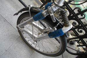 さらに、現在、前輪のブレーキワイヤーの引きが固すぎて、ブレーキの効きがメチャ悪いという状態なので、ブレーキワイヤーを交換しなきゃと思っているのですが・・・BD-1の前輪のブレーキワイヤーの交換って、ものすごく面倒。一度、チャレンジしたんですが・・・アウターワイヤーを、前輪の折れ曲がっている構造のフレームの中に通さなければならなくて、これがなかなか通らない。そんな苦労を思い出し、今日は、ブレーキワイヤーを交換する気がおきず。うむむ、この作業は、もっと気分がノッている日にやることにしよう。