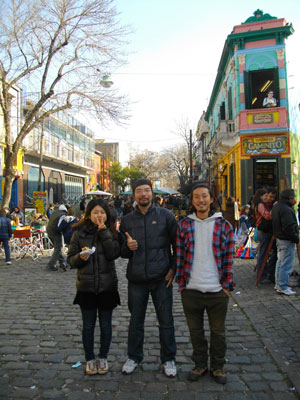 まずは腹ごしらえということで、露店で売っているチョリパンを3人でパクリ。その後、カミニートの一番の目抜き通りを散歩しながら、タンゴのフリーライブなどを見つつ、カラフルな建物群を鑑賞。そのまま足をのばして、ボカスタジアムにも行き、周囲をブラブラ・・・