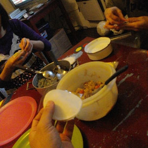 で、延泊を決めたものの、特にすることがない本日。最後にカレーでも作るかと、肉を買出しにスーパーへ。戻ってくると、キッチンでは、サオリさんが、餃子つくりに挑戦していた。隣で、カレーの仕込みをさせてもらい、ひと段落したところで、餃子の皮包みのお手伝い。餃子職人としては、餃子を隣で作られていると、ウズウズしちゃって・・・皮包みくらいはお手伝いしないとね。さて、今回のサオリさん餃子は、餃子の皮をエンパナーダの皮で代用するとのこと。パン生地のようなエンパナーダの皮で、餃子になるのかいな?と思うオイラなのですが、意外とちゃんと餃子になるらしい。