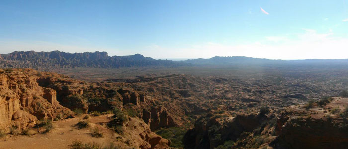 息を呑むとは、まさにこのこと。しばらく体が止まってしまいました。目の前に広がるのは、グランドキャニオンを彷彿とさせる、大渓谷。いや、渓谷じゃないな、グランドキャニオンが、コロラド川によって削られた大地だとすると、ここQuijadasは、川に削られる前の大荒原。2億年前の風景と、説明書きにはかかれていましたが、いや、まさに、恐竜時代の地球ってこういう場所が広がっていたに違いないと思わされる風景だったのです。しかも、ここ、なにもない牧場地帯が広がるアルゼンチンの台地に、一角だけポッカリと取り残されたように150000ヘクタールもの荒原世界が存在しているんです。オイラ的には、ロライマより<ロストワールド>を感じてしまいまして。